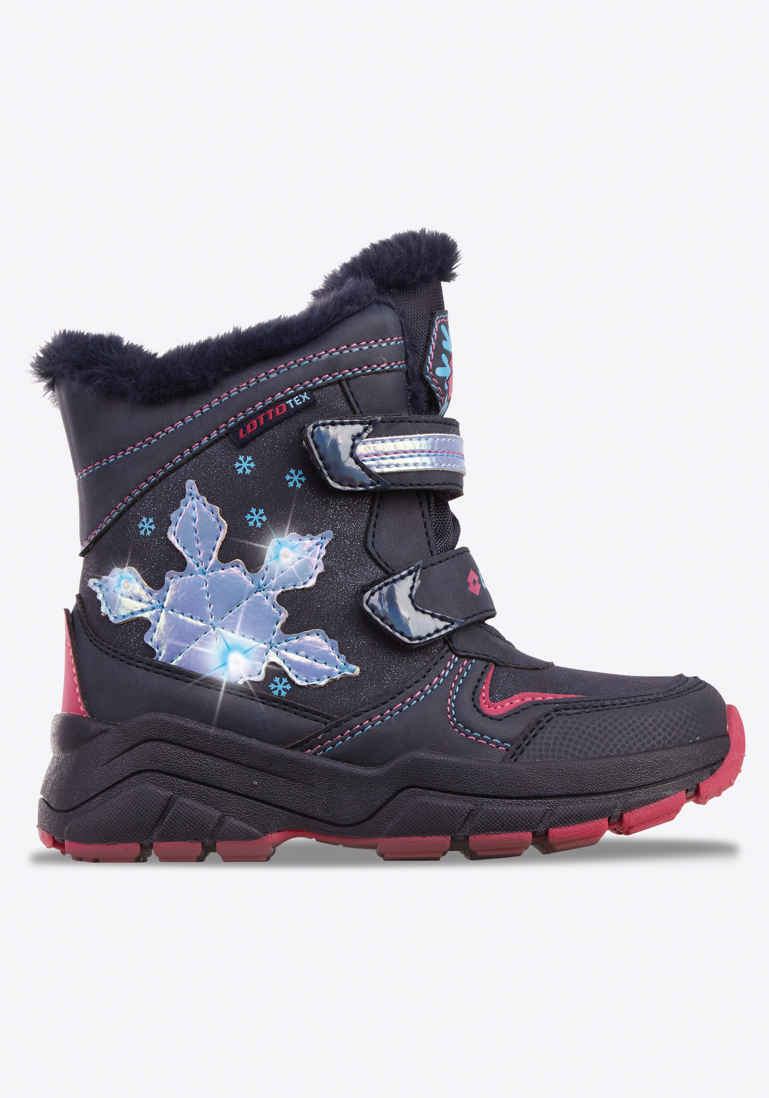 Ideal für die kältere Jahreszeit geeignet, sind diese kuschelig warmen LED Kinderboots von Lotto. Mit wasserdichter, windabweisender und atmungsaktiver Tex-Membran halten sie zarte Kinderfüße auch bei rauher Witterung warm und trocken. Eine robuste, zweifarbige Sohle verleiht Grip auf nassen, rutschigen Untergründen. Mit Blinklicht und glänzender Schneeflocke kreieren sie im Nu einen fröhlichen Winter-Look. Gleich zwei praktische Klettriegel machen das An- & Ausziehen zum Kinderspiel. Auf Spezialleisten gefertigt, garantieren die Winterboots eine kinderfußgerechte Passform. Für eine verbesserte Sichtbarkeit im Dunkeln sind die Klettboots neben leuchtenden LED Lichtern zudem mit reflektierenden Details ausgestattet. So steht dem Outdoor Feeling auch bei rauher Witterung nichts im Weg - mit den Winterschuhen von Lotto.
